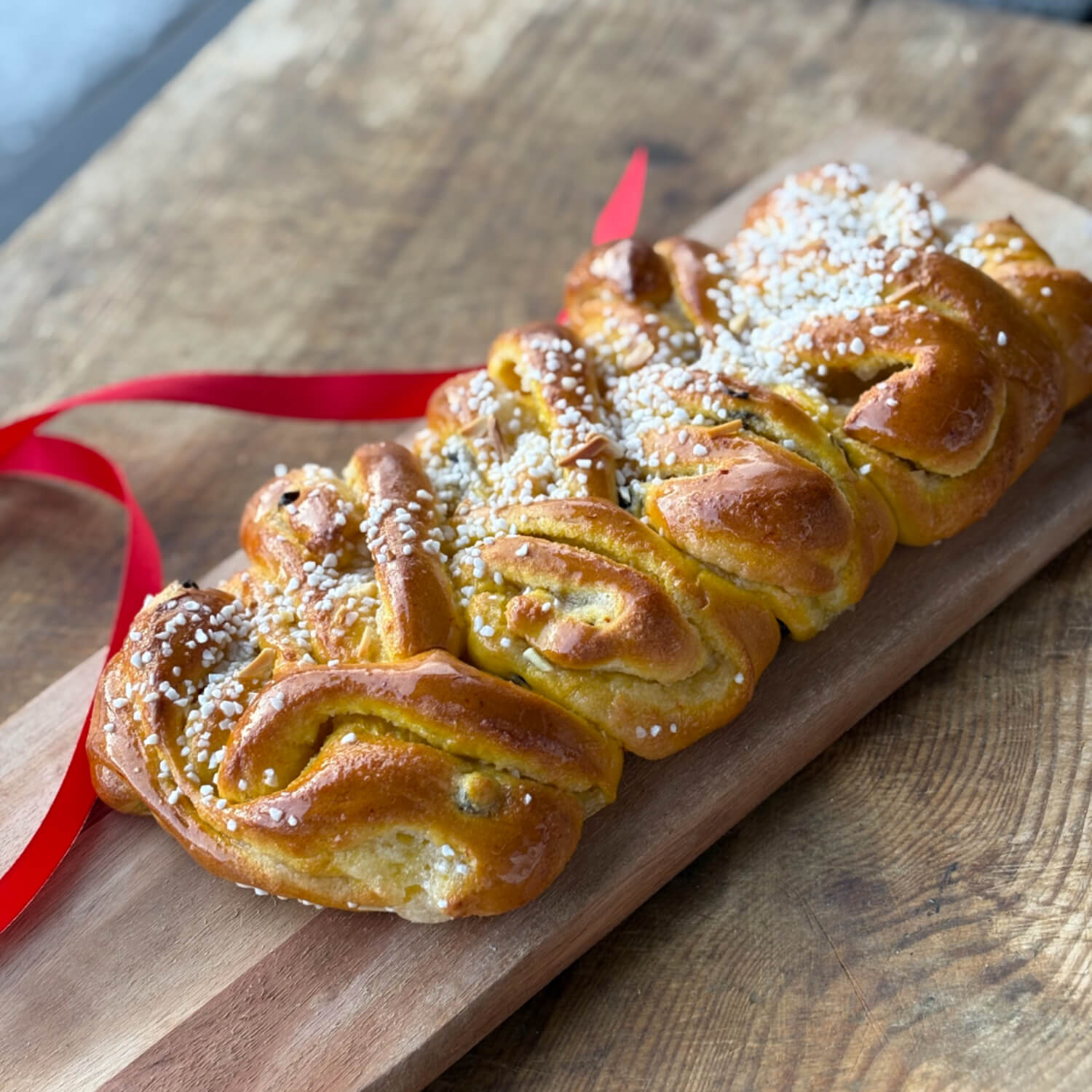 Saffranslängden bakas med äkta saffranspistiller & våran super goda fyllning. Innehåller russin.