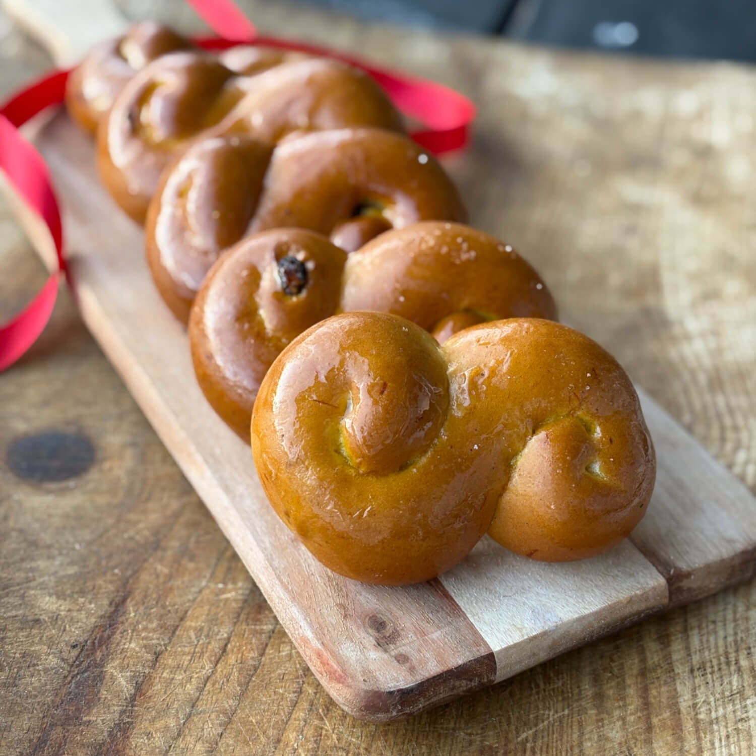 Äntligen är det tid för saffran! Vi använder oss av äkta saffranspistiller i våra bullar och de rullas för hand i vårt egna bageri. Våra lussekatter innehåller russin.