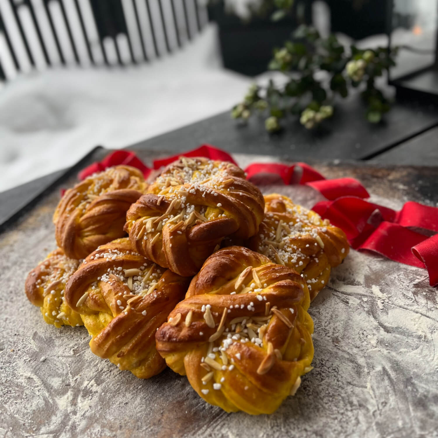 Saffranslängden bakas med äkta saffranspistiller & våran super goda fyllning. Innehåller russin.