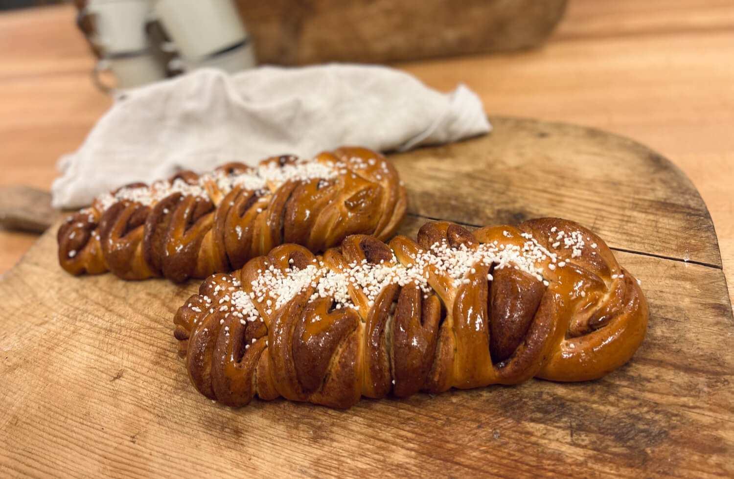 Vetedeg med kardemumma, fyllning med smör, kanel och socker, självklart med pärlsocker ovanpå.